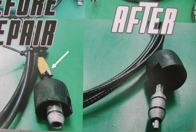 修理後の写真を見ると、アウターケーシング(鞘)の部分が新品になり、ミッション側に付くスピードメーターケーブルの先がカシメなおされている(純正とカシメ形状が異なっている)。元部品の流用してカシメ直したのだろうか。