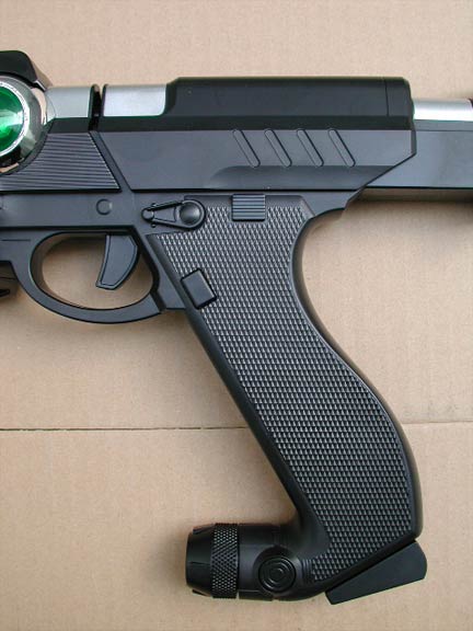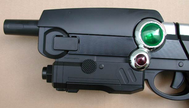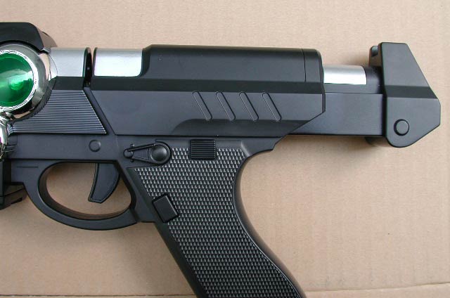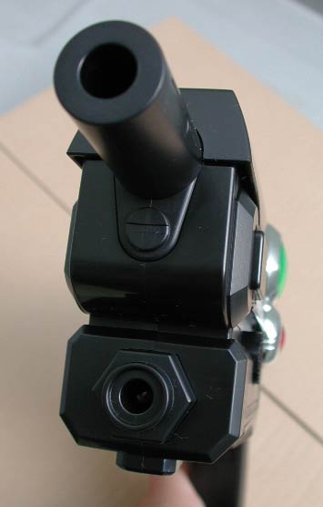 立体造形をみるため、斜め正面方向から見てみる。上の穴は銃口、下の穴は照準用のレーザーポインタ。なお本モデルではレーザーポインタになって折らず、LEDが光るだけである。