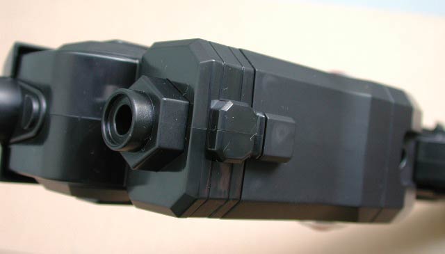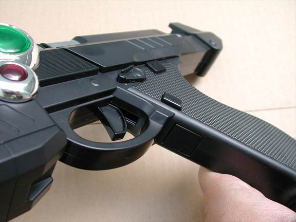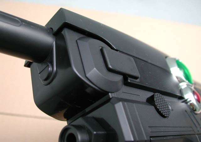 銃口の下あたり。実はここが電池ケースとなっている。ビスが見えるが、このビスを外すと電池ボックスが見えてくる。