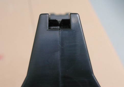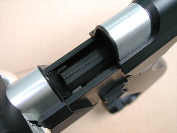 弾倉を抜く・弾切れになると、写真のようにスライド部分が開いたままになる。なお弾倉を入れると自動的に閉じる。