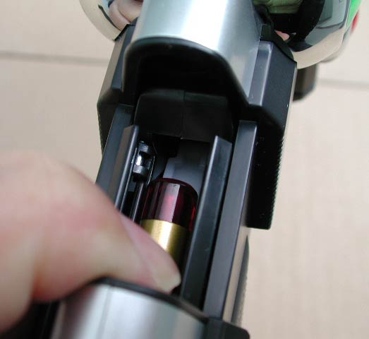 指で扉を開けると、中に弾が見えてくる。このモデルの売りは、引き金を引いた後の次弾装填のアクションだ。が、排莢のアクションはない。