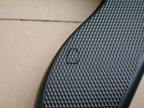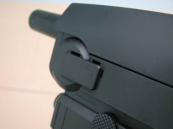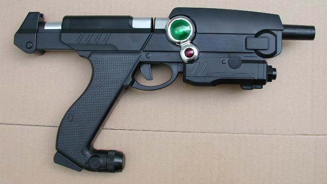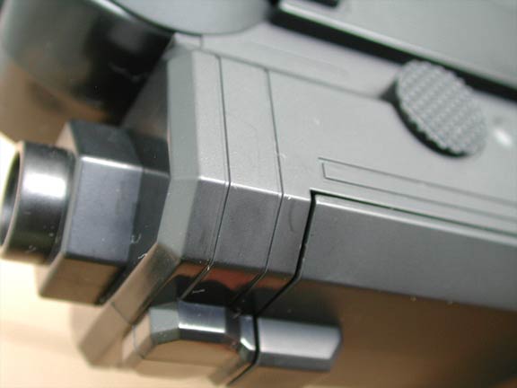 下の写真は、逆に表面の方の加工が目立っている部分。表裏で比較すると、表の方にスリットがある。これはアクションの際に音を出すスピーカーのスリット。銃を右手で持った際、右耳に近い側にスリットを開けたのだと考えられる。