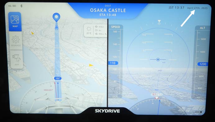 モニターには、上空から見た地図が映し出されていた。基本、陸が見える範囲を飛ぶ想定なのだと思う。速度は110km/h、MAXでも160km/hのようなので、飛行機と比べるとかなり遅い。ちなみに右上に日付や時刻が表示されているが、これが全然違う。