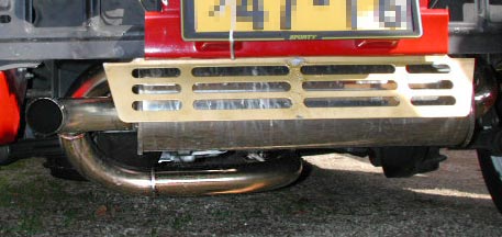 まずは2本だしのマフラー。そのまま装着するとマフラーのタイコとペリメーターフレームが干渉してしまうとのことで、マフラーについているハンガーを無理矢理曲げて装着していた。パワーの方については折り紙付きだが、アクセルをOFFにしたときの音が特にうるさいとのこと。