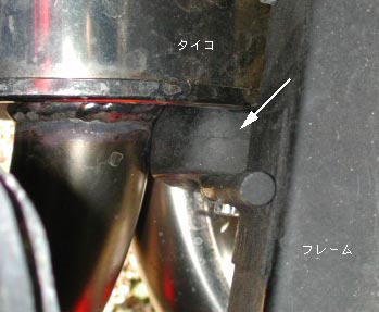 お次は1本だしマフラー。これを取り付けると干渉するというレベルを超えていて、マフラーとフレームの間にラバーハンガーが挟まれた状態でないと取り付けができないようだった。