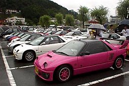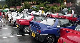 AM10:00。河口湖市営無料駐車場には、AZ−1の姿が1台もない。「やっぱり、この雨だからな・・・・」ちょっとがっかりしてしまいましたが、そんなこともすぐに解消。次から次へとAZ−1が集まってきました。30分後、写真のようにAZ−1大集合!「雨」なんか、全然関係なかったです。遠くから来てくれたオーナーもたくさん居てうれしいですね。やっぱり。