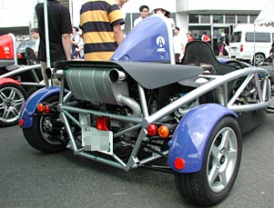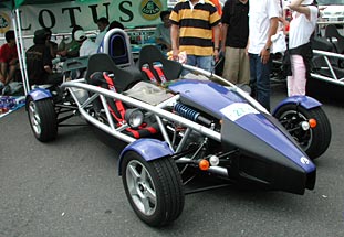 出たあ、全身スケルトンのパイプフレーム車。リアミッドシップでエアインテークが頭の上にあるは、申し訳程度にしか風防はついてないは、ソフトトップさえ備えていないその作りはまさに公道を走る2シーターのF1と言えよう。これで485万円(だったかな)は安い。