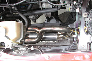 エンジンルームから見ると、排気管の取り回しは下の写真のようになっている。