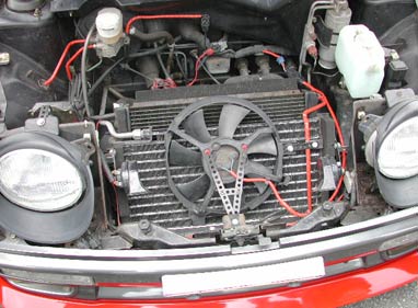 ボンネットを開けるとラジエターファンが見える。このAZ−1は通常のラジエターファン(ラジエターの裏側にある)に加えて、写真に写っているものもあるのだ。通常のラジエターファンは空気を吸い込むのだが、追加されたファンは空気を送り込む役割をしている。上の写真をみるとロドリゲスさんの車のボンネットにはエアダクトが開いているが、追加のラジエターファンはボンネットに穴のあいているものに特に有効である。