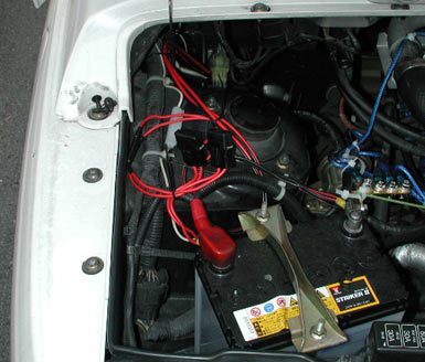 電源の取りまわし。右にある青のケーブルはアーシングでHIDには関係ない。赤いコードがHID用の配線である。配線の途中にヒューズが付いている。