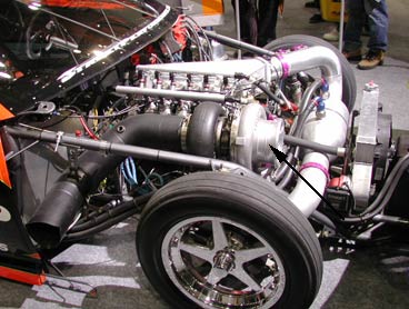 ちょっと見にくいが、矢印で示してあるのがタービンである。それから直管のマフラーが突き出ている。