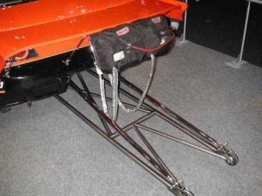 リアにはウイリー防止用のバーがついている。ウイリーバーの上に付いている2つの黒い袋はパラシュートだ。一旦走り出したらブレーキではなく、パラシュートで減速させる。