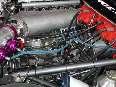 エンジンは20Bをベースとしたもので、出力は1500ps。この車を見ていたギャラリーは一様に驚いていたが、ドラッグレースの世界では1500psは相当小振りの部類に入る。最も出力の大きいエンジンを積むファニーカーとかトップフュエルと呼ばれるクラスでは5000psを超える(正確なところは不明)。不明な理由だが、エンジン出力もここまで来ると、吸気温とか大気圧でかなり変わってくるのだそうで、正確な値が出せないとのこと。5000psに対抗しようとしたら6ローター&ツインターボくらいいるなあ。しかし、エキセントリックシャフトが長くなり加工がむずかしくなるし、仮に出来たとしてもシャフトが出力に耐えられないだろう。