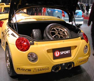 と思いきや、ただのコペンではなかった。なんとコペンのケツを流用したキャリアカーがついていたのだ。上の写真はコペン本体ではなく、キャリアカーのケツである。マフラーも見えるが、これはダミー。ここまで作りこんでいるのだ。なかなかカッコイイ。