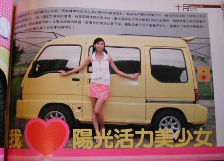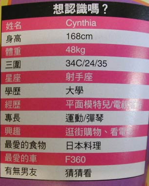 表の上から4段目、34C/24/35と書いてあるが、これは3サイズだろうか。だとするとCカップ。単位はインチでないと実体に即さない。身長と体重はcgs単位系なのに、なぜ3サイズだけインチ(?)なのだろうか?? 好きな食べ物は日本料理、好きな車はF360とふざけている。軽ワゴンをバックにしておいて、そんなこと言うなって。
