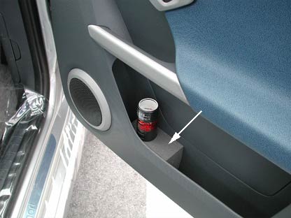 まずは日本仕様なのか、運転席ドア下のポケットに発煙筒ではなく非常灯があった。まあこれはいい。ところが非常灯を挿している入れ物が、単なるウレタンの塊なのだ(矢印部分)。