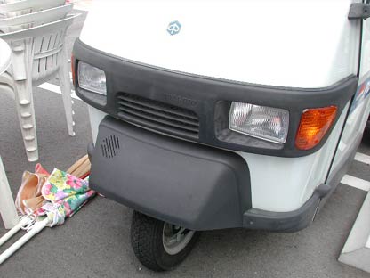 斜め前から見たところ。運転席キャビンより荷台が大きく張り出ている。見た目、安定感が悪そうだ。昔は三輪トラックがコーナリング中にバランスを崩してよく転けていた。あれから40年の歳月をかけてよみがえった現在の三輪トラックは、十分に粘れるように改良が進んだのだろうか。