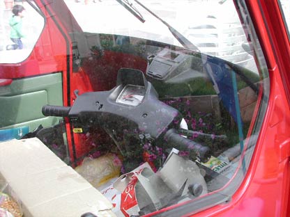 外装に続き、内装もええ味出しとる。スマートフォーフォーと大違いだね(←いったいどういう感覚してるんだ!?)。ステアリング部分。原付のハンドルと同じで、大昔の三輪トラックと同じやりかただ。制動は足下にあるペダルではなく、ステアリングについているレバーで操作。これもまたスクーターと同じ。