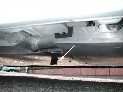 では車の底を見てみよう。すると・・アルミの板を切った貼ったの世界だった。下の写真示してある矢印のホースだが、実はここから水が出てくるのだ。写真ではよく分からないが、ホースはそこら辺に捨ててあったようなラジエターホースの切れっ端みたいなものでできていて、切り口もかなり荒かった。