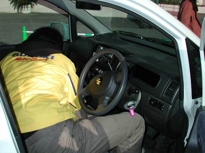 現在調整中。実はこの写真を撮影した時点でスズキの燃料電池車だけがガス欠(水素がなくなった)で試乗会を途中で中止してしまったのだ。写真に写っている人は何をしているかというと、グローブボックス内にあるメーターを見ているのだそうだ。
