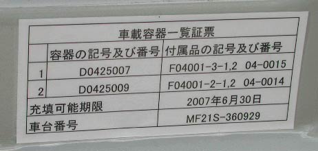 燃料電池車のボンネットに貼ってあったラベル。水素タンクの使用期限とかいろいろかかないといけないらしい。タンクの使用期限がもう切れるが、将来的には使用期限が10年ほどになる見込みだ。