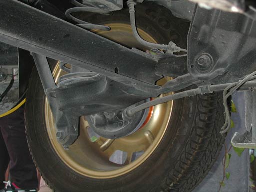 下回りを見てみると・・・FFの車の後ろ部分が使われているようだ。トレーラーのシャシーの上に2000GTのかぶせ物をしているわけではないことがわかる。